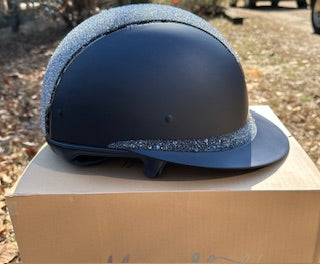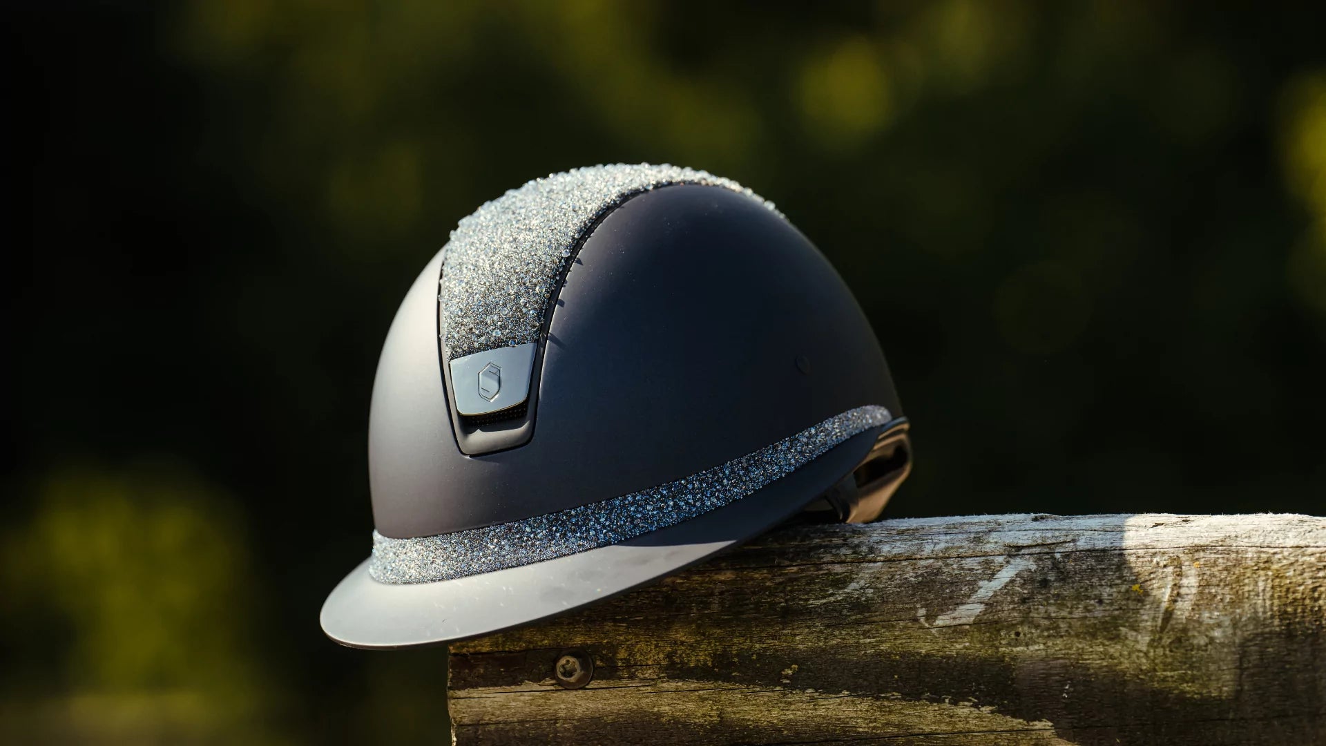 This Samshield Miss Shield is equipped with a Fine Medley Swarovski top and frontalband in Moonlight and black crome trim and blazon.